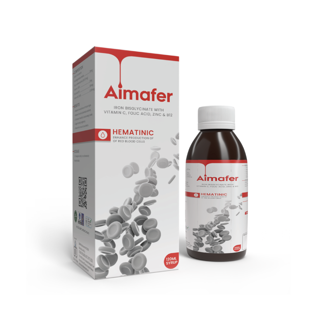 Aimafer Syrup consist of an advanced and patented form of iron which is non constipating and very gentle on the stomach. It is a highly absorbable form of iron which promotes red blood cell production. Vitamin C and folic acid also enhances absorption of iron. It helps to prevent iron deficiency anemia in children and adults.